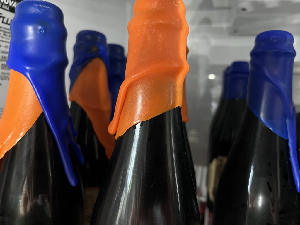 Most of the brown bottles have been dipped in wax – a thick coating that covers the cap and drips down the neck.